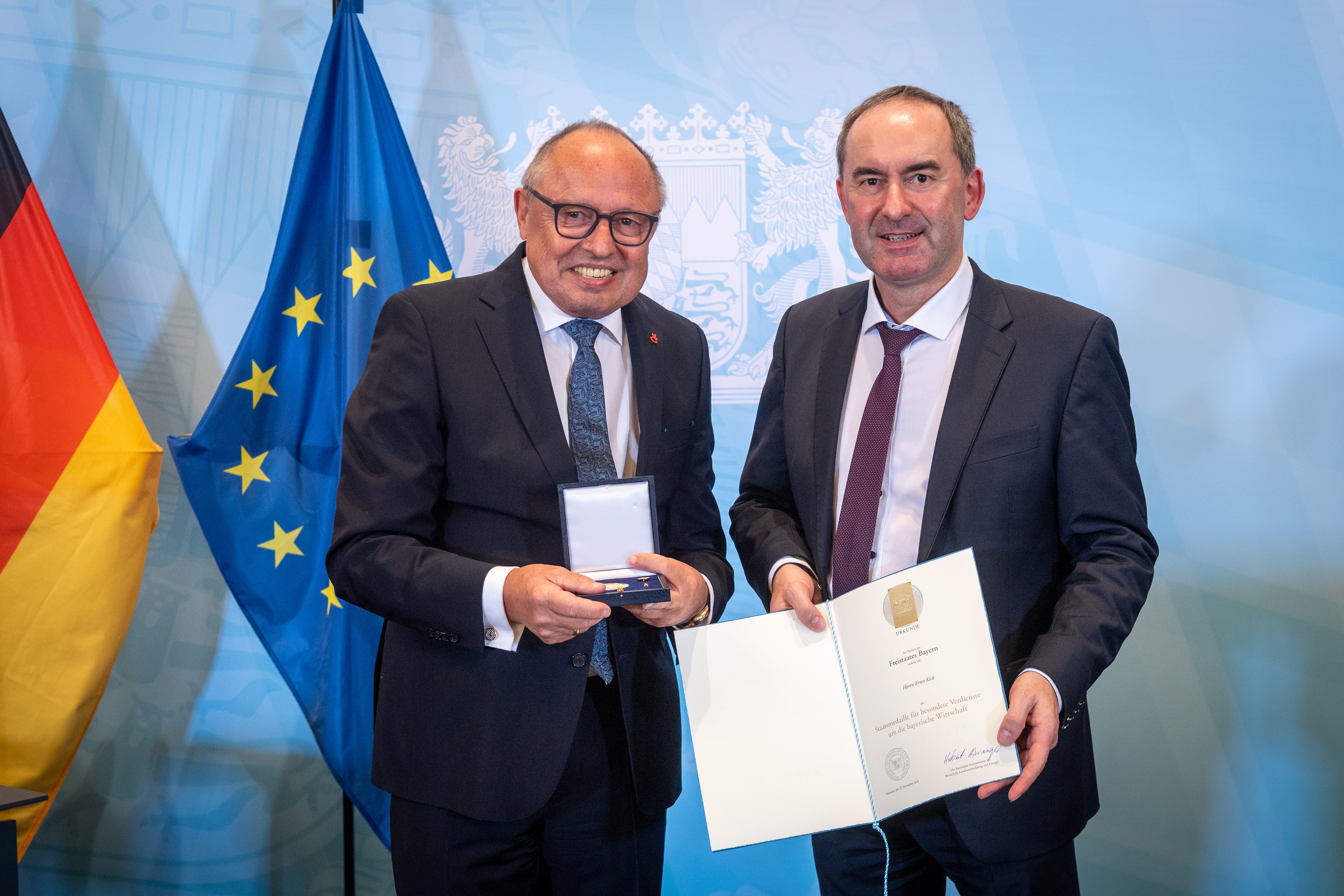 Der frühere langjährige Vorstandsvorsitzende der Spielwarenmesse eG, Ernst Kick, ist mit der Staatsmedaille für besondere Verdienste für die bayerische Wirtschaft ausgezeichnet worden. Die feierliche Verleihung fand am 27. November durch das Bayerische Staatsministerium für Wirtschaft, Landesentwicklung und Energie in München statt. Seit 1974 werden höchstens 25 Personen pro Jahr mit der Staatsmedaille geehrt. Überreicht hat die Auszeichnung Bayerns Wirtschafsminister Hubert Aiwanger. Er würdigte in seiner Laudatio vor allem die einmalige Position und herausragende Stärke der Spielwarenmesse. Zudem habe sie eine entscheidende Rolle in der Entwicklung der NürnbergMesse gespielt.
